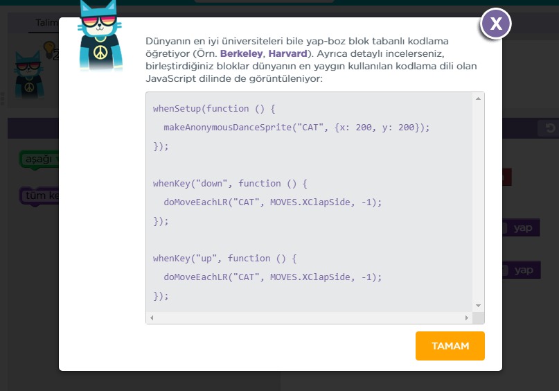 Bunların yanı sıra ise derslerde sanki oyun oynarcasına yazılan kodların herhangi bir proglamlama dilindeki karşılığına erişmek de mümkün.