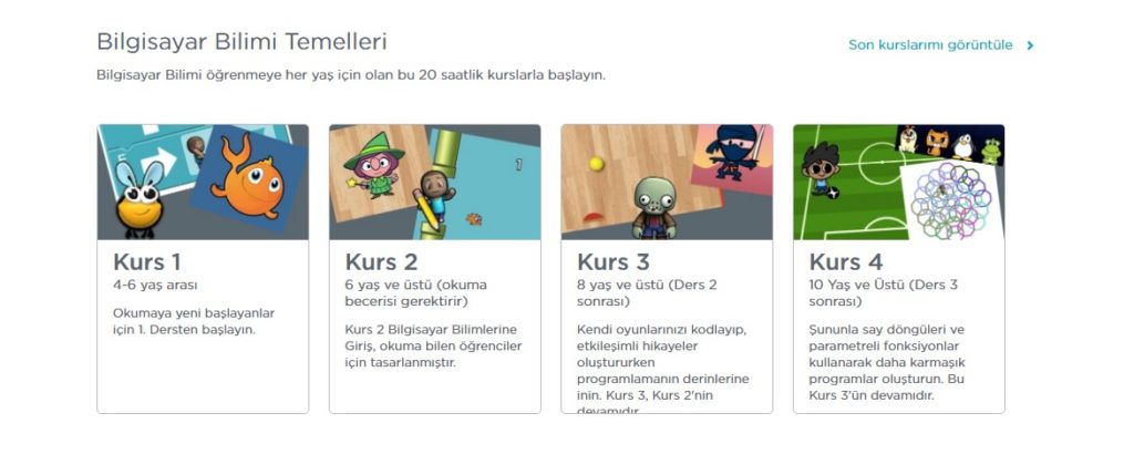 Diğer bir kategoride bilgisayar bilimleri temelleri adı altında yaş gruplarına bölünmüş dersler mevcut. Code org içeriği bu konuda çok zengindir.