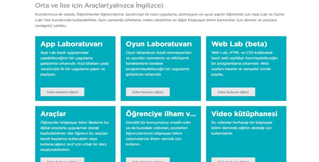 Yine bu sayfada orta okul ve liseler için öğretmenlerin öğrencilerine JavaScript ile nasıl uygulama , oyun ve animasyon yapılır öğretmen için AppLab ve Game Lab bulunmakta.
