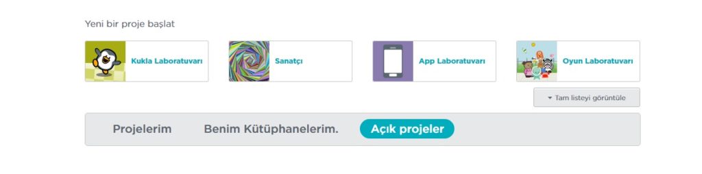Buradan çıkıp projeler kısmına girildiğinde açılan sayfadan yeni bir proje başlatabilen kullanıcılar aynı zamanda sitede daha önce üzerinde çalıştıkları projelere de buradan ulaşabilmekteler.
