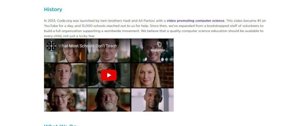 Projeler butonunun yanındaki hakkında butonuyla sitenin kuruluşu , amacı , tarihçesi gibi bilgileri içeren hakkında kısmı bulunmakta. Aynı zamanda burada Bill Gates , Mark Zuckerberg gibi yazılımcıların da bulunduğu bir tanıtım videosu yer almakta.