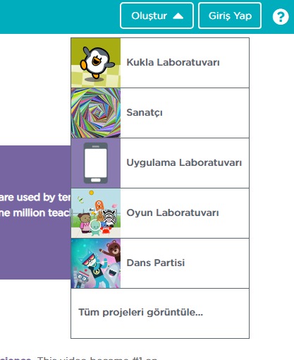 Hemen yanındaki giriş yap butonu siteye üyelik girişi yapmanızı üye değilseniz de üye olmanızı sağlıyor. Onun yanındaki oluştur butonuyla da mevcut projelere ulaşabiliyoruz.
